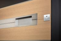 Holz 100, flächenbündig | Holzart Eiche, Quermaserung | Lasur Nussbraun | PaXsecura 200 | Komfort-Paket 2 | Türöffnung über Fernbedienung | Außenseite: Alunox-Dekorleisten | Applikation Eiche gebürstet, Lasur PaXnatura pur | Edelstahl-Muldengriff S8801, flächenbündig integriert | Innenseite: Innendrücker D_1102 | verdeckt liegende Haustürbänder